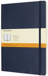 Modrý linkovaný XL zápisník v měkké vazbě. Obepíná ho pružná páska proti samovolnému otevírání. Každý zápisník je vybaven pořadačem poznámek, který je vyroben z tkaniny a kartonu, textilní záložkou a letákem s historií Moleskine. Papír s gramáží 70 g/m2 neobsahuje kyseliny.
